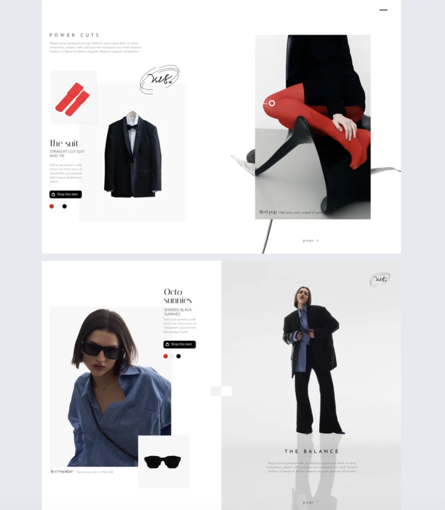 Real-world application: A fashion brand dropping a new seasonal collection can use this template to lead with large, bold campaign shots, embed a behind-the-scenes video from the shoot, and add popup slideshows for each look so viewers see styling details without cluttering the main layout. Dedicated shop areas and clickable buttons link each piece directly to its product page. Viewers go from “I love that” to “add to cart” in one click.