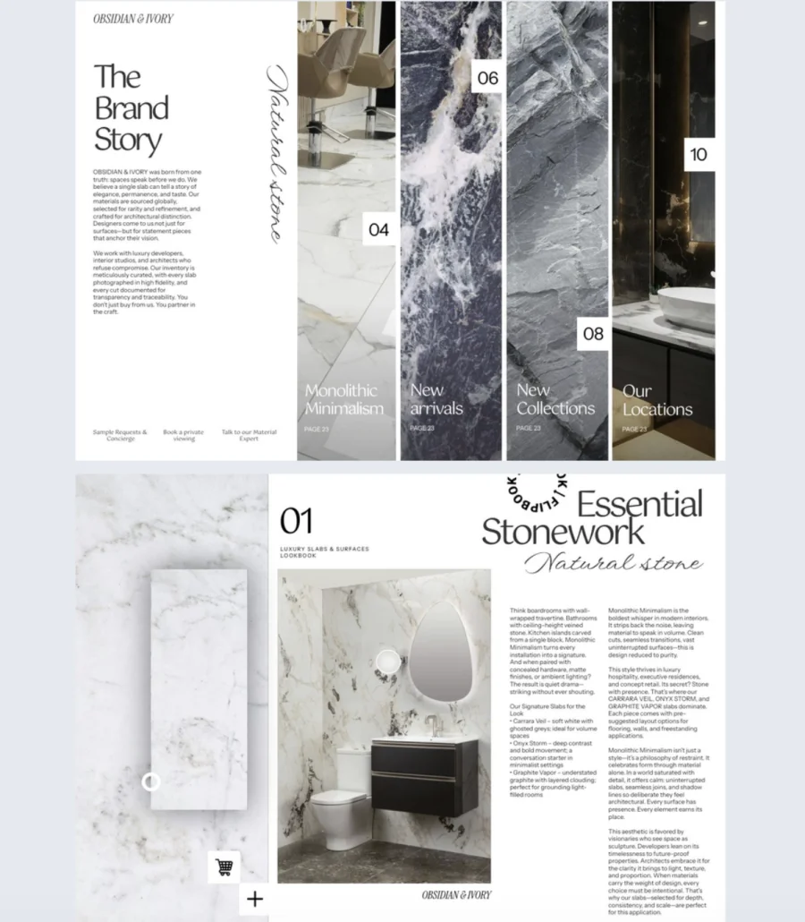 | Luxury Slabs & Surfaces Lookbook Template | Construction / Luxury Materials | Suppliers, showrooms, manufacturers of premium surfaces | Marble, granite, quartz, luxury slabs | Large photo slideshows, spotlight sections, video presentations; shopping lists, embedded showroom maps, lead forms. |