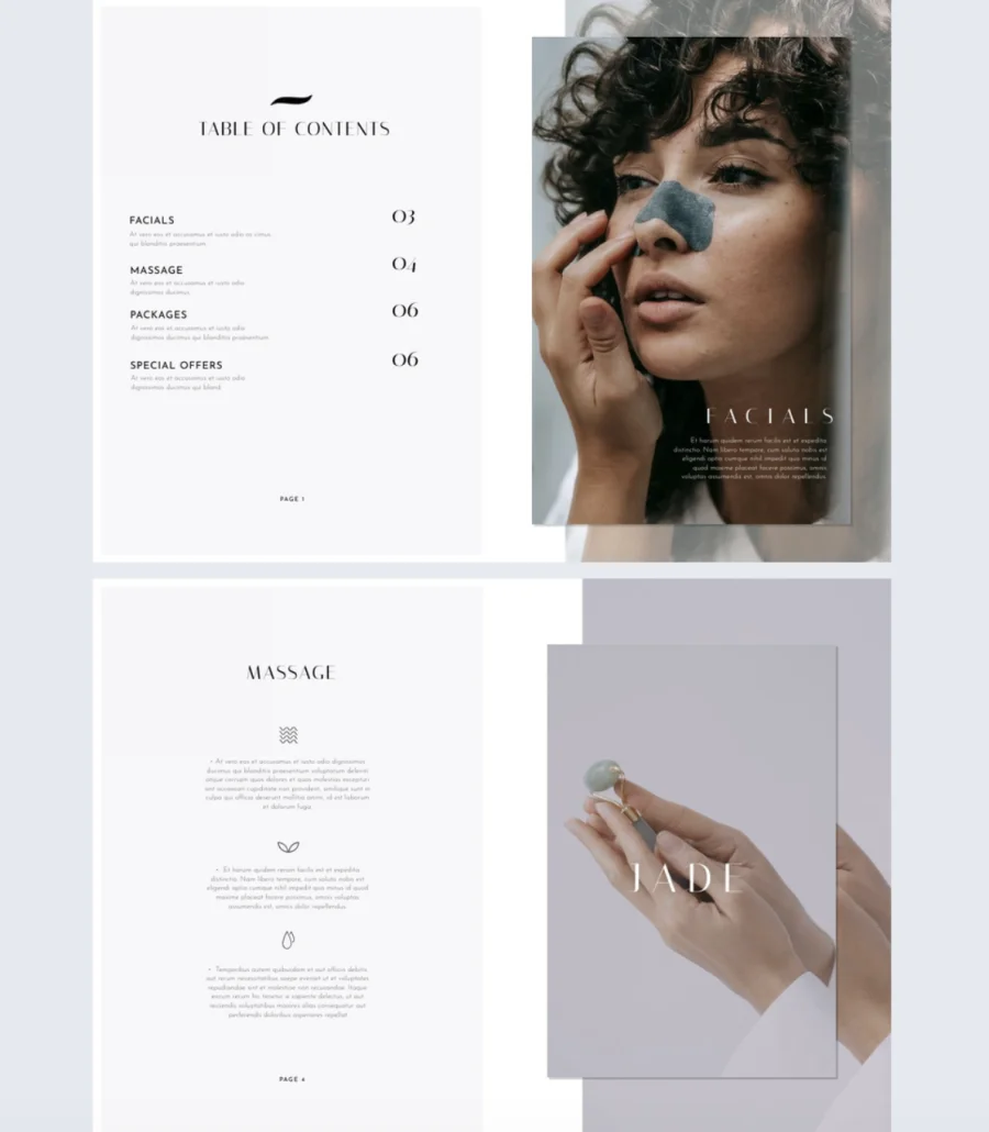 The clean, consistent layout features high-quality images for each treatment with a similar design across every two-page spread for a polished look. Customize it in Flipsnack’s Design Studio. Add videos, photo slideshows, and direct links. Upload your own images or choose from Flipsnack’s free stock library.