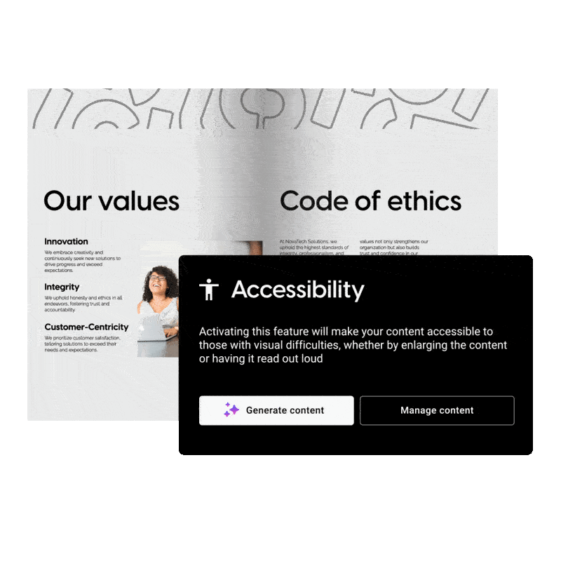 Flipsnack includes AI tools that can generate page summaries. This is useful for older or very visual documents, since it speeds up the work of creating an accessible text layer. Staff still review and refine the results, but they no longer start from a blank page.
