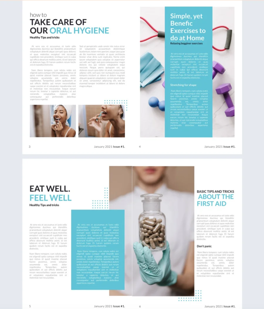 Real-world application: A healthcare organization producing a quarterly publication can use this template to cover topics like first aid best practices, preventive care, mental health awareness, and emerging treatments. The table of contents keeps everything organized so readers jump directly to the subjects they care about. Add a unique cover photo for each edition, choose your own typography and color scheme for a branded look, and customize every page to match your organization’s voice. Among medical newsletter examples, this format works when your content goes deeper than a standard newsletter page layout and needs the space and structure of a full magazine.