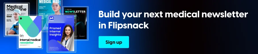 Browse Flipsnack’s library of medical newsletter templates and healthcare newsletter templates. From internal staff updates to patient-facing wellness publications, you’ll find newsletter templates for hospitals, clinics, care facilities, and medical organizations. Pick the one that matches your use case and start editing, or choose one from this list. Already have a newsletter as a PDF? Upload it directly and Flipsnack converts it into an interactive digital publication.