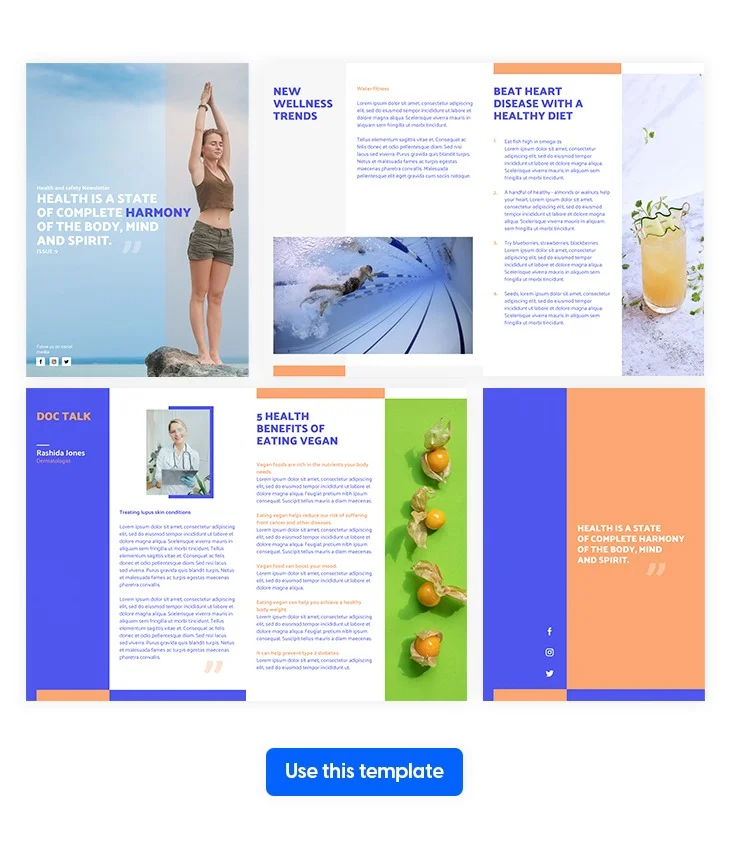 Best for: Clinics, wellness centers, and healthcare organizations that need a wellness newsletter template for patient education and community engagement. Among health newsletter examples, this one works for organizations that want to promote healthier habits without sounding clinical.