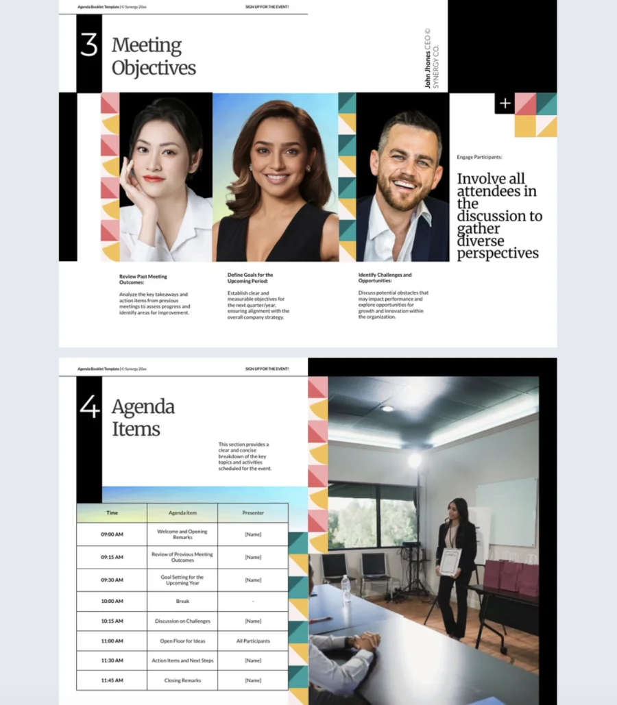 Meeting agendas sent as email attachments get buried, skimmed, or ignored entirely. This template turns your agenda into an interactive booklet that keeps organizers and attendees aligned before, during, and after the event.