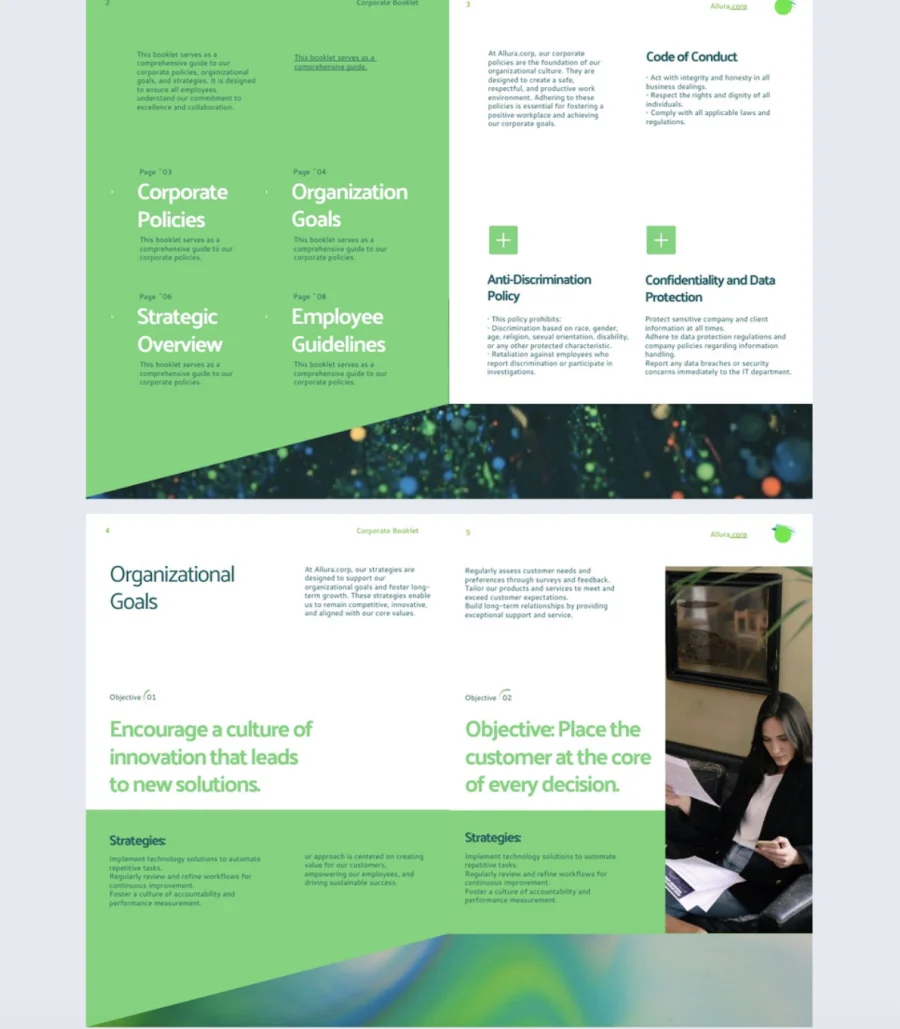 Common mistake to avoid: Don’t publish a 40-page corporate booklet with no navigation. Add a clickable table of contents and clear section headers so employees jump to what they need instead of scrolling through policies that don’t apply to them.